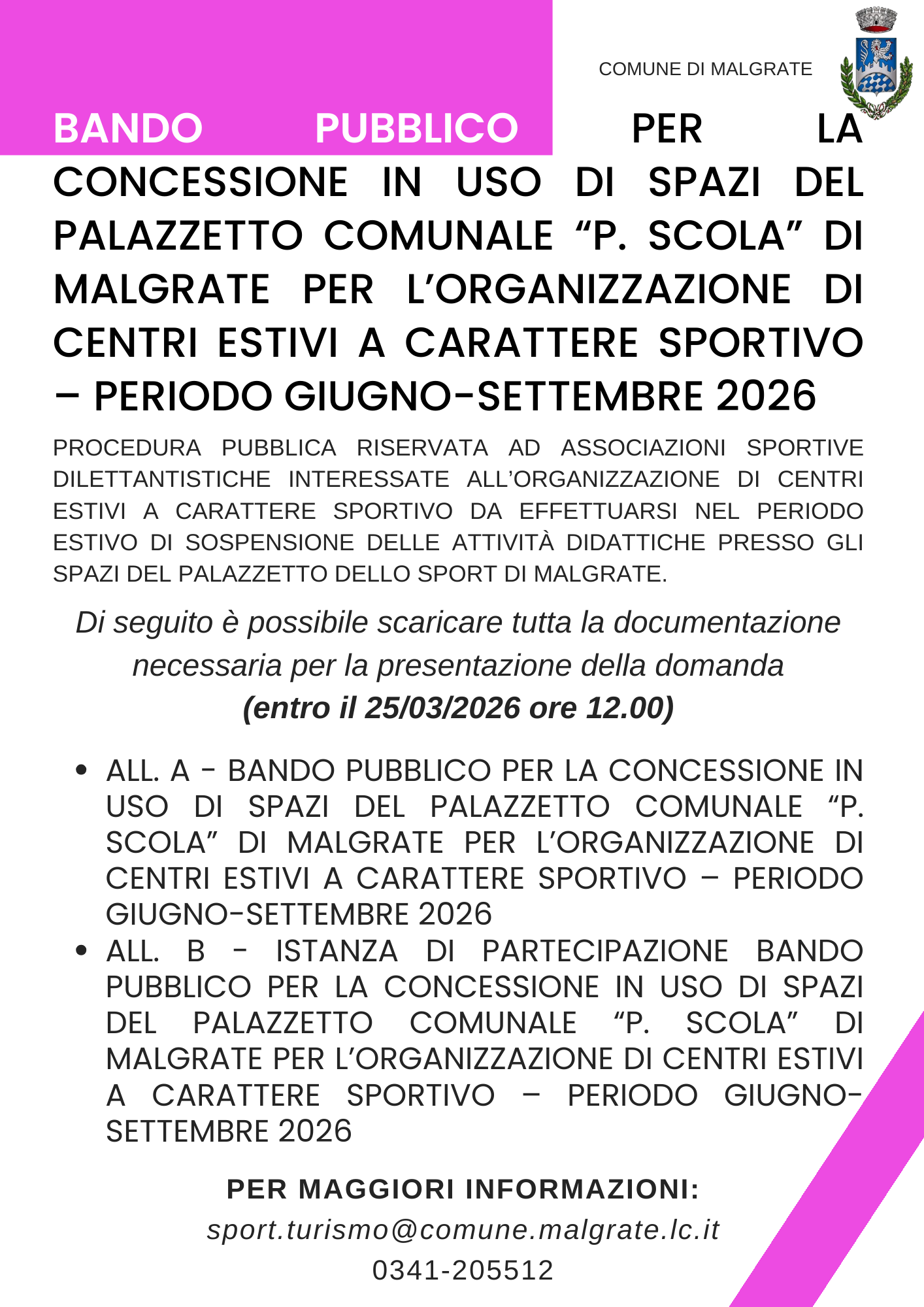 Con il presente bando pubblico, l'Amministrazione Comunale intende individuare Associazioni sportive dilettantistiche interessate all'organizzazione di Centri Estivi a carattere sportivo da effettuarsi nel periodo estivo di sospensione delle attività didattiche presso gli spazi del Palazzetto dello Sport di Malgrate.