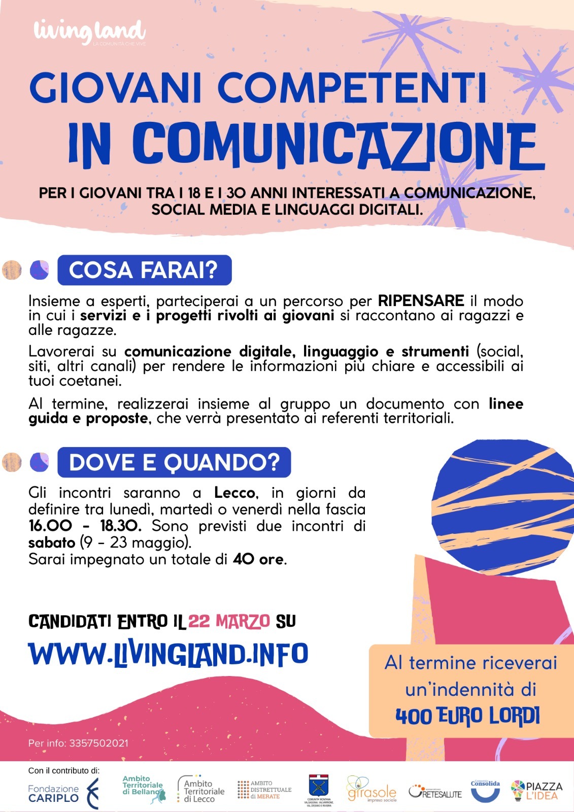 CANDIDATURE SUL SITO DI LIVING LAND https://www.livingland.info/bandi/giovani-competenti-in-comunicazione/ ENTRO IL 22 MARZO.