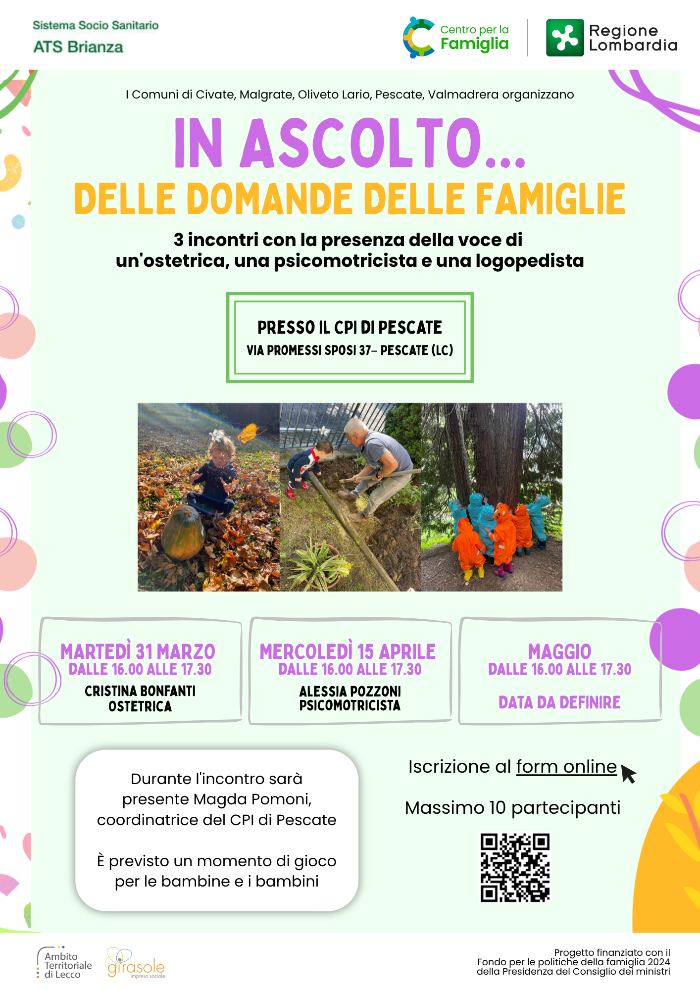 A tutti e tre gli incontri sarà inoltre presente Magda Pomoni, coordinatrice del CPI di Pescate. Per ogni data è previsto anche un momento di gioco per tutti i bambini e bambine presenti.
